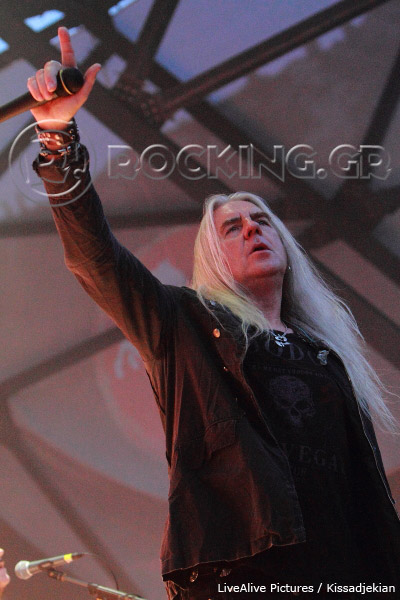 Ήταν 20:50 όταν βάσει προγράμματος τα κλουβιά άνοιξαν και οι αετοί πέταξαν ελεύθεροι για άλλη μια φορά στον αττικό ουρανό. Οι Saxon είναι από τα συγκροτήματα που ο γραφών θα το έβλεπε ακόμα και αν έπαιζαν κάθε εβδομάδα στη χώρα μας. Αυτό όμως δεν σημαίνει ότι πρέπει να υποκρύπτονται και οι όποιες ατέλειες (εντός ή εκτός εισαγωγικών) έχει μια εμφάνισή τους στη χώρα μας. Σχεδόν κάθε χρόνο μάς επισκέπτονται χαρίζοντας στους οπαδούς μοναδικές στιγμές. Όπως και τώρα, απλά με ένα «αλλά». Το intro και πρώτο ομώνυμο τραγούδι της τελευταίας studio δουλειάς τους, "Procession" και "Sacrifice" αντίστοιχα, άνοιξαν το setlist τους που ήταν το πλέον ιδανικό για όποιον τους έβλεπε πρώτη φορά. Ξεκίνησαν με αρκετά προβλήματα στον ήχο κάνοντας το κοινό να τους αντιμετωπίσει με μια -ευτυχώς μικρή- παγωμάρα. Ευτυχώς αργότερα ήταν πιο εκδηλωτικό και συμμετείχε πολύ πιο ενεργά σε κάθε σύνθεση αλλά και στο όποιο κάλεσμα απο μικροφώνου του frontman τους. Ειδικά στα πρώτα τρία τραγούδια και οι μουσικοί αλλά και ο Biff Byford, τραγουδιστής και μια από τις πιο εμβληματικές φυσιογνωμίες στο heavy metal, σχεδόν δεν ακούγονταν. Δυστυχώς ο Biff συνέχισε μέχρι και σχεδόν την μέση του set να μην είναι στην φόρμα που τον έχουμε συνηθίσει. Μια βραχνάδα έβγαινε από το λαρύγγι του λες και είχε αναρρώσει από αρρώστια στον λαιμό ή κρύωμα. Εντύπωση μου έκανε ότι άλλαζε συνεχώς μικρόφωνα μόλις τελείωνε το κάθε τραγούδι. Παρόλα αυτά, από τη μέση και μετά η φωνή του επανήλθε κάπως στο γνώριμο ύφος αλλά σε καμία στιγμή της εμφάνισης δεν έπιασε το 100%. Εκείνος όμως, έμπειρος γάρ, έχει τον τρόπο ακόμα και αυτό το «πρόβλημα» να μην τον αποτρέψει από μια καλή εμφάνιση.