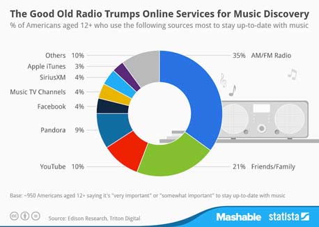 Παρά την εισαγωγή ολοένα και περισσότερων νέων μέσων τα τελευταία χρόνια, το ραδιόφωνο παραμένει για τους Αμερικανούς με διαφορά ο δημοφιλέστερος τρόπος για να ανακαλύψει κανείς καινούργια μουσική, σύμφωνα με έρευνα που δημοσιεύει το Mashable.